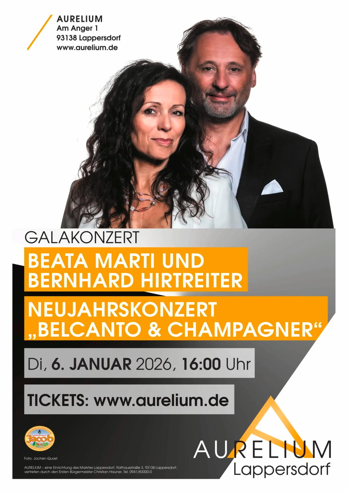 Schwungvoller Jahresbeginn im Lappersdorfer AURELIUM: Auch 2026 begrüßt das charmante Sängerpaar Beata Marti & Bernhard Hirtreiter das neue Jahr mit einem unterhaltsamen und kurzweiligen Neujahrsprogramm. Unter dem Motto „Belcanto & Champagner“ haben die beiden Ausnahmekünstler wieder illustre musikalische Gäste und ihre wunderbare Begleitcombo eingeladen. So wetteifern diesmal gleich drei gut gelaunte Tenöre mit Stimme, Charme und Vibrato um die Gunst einer mondänen Sängerin – und natürlich des Publikums.